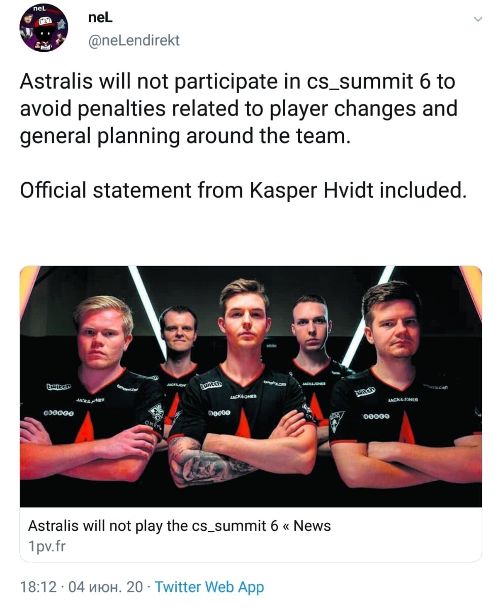 Astralis решили не принимать участие в cs_summit 6 - втором турнире, дающем RMR-очки.