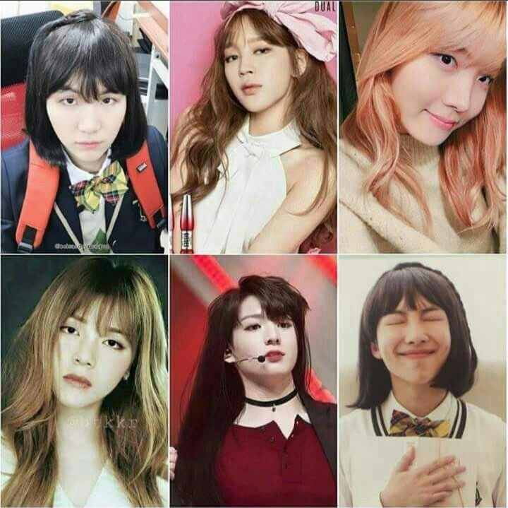 Наткнулась в интернете на некоторые фотки ВТS в образе девушек, видимо 100% фотошоп, но, как можно заметить, довольно таки качественный. Сначала подумала сестры айдолов, но НЕТ, знаю, что у многих нет сестер.