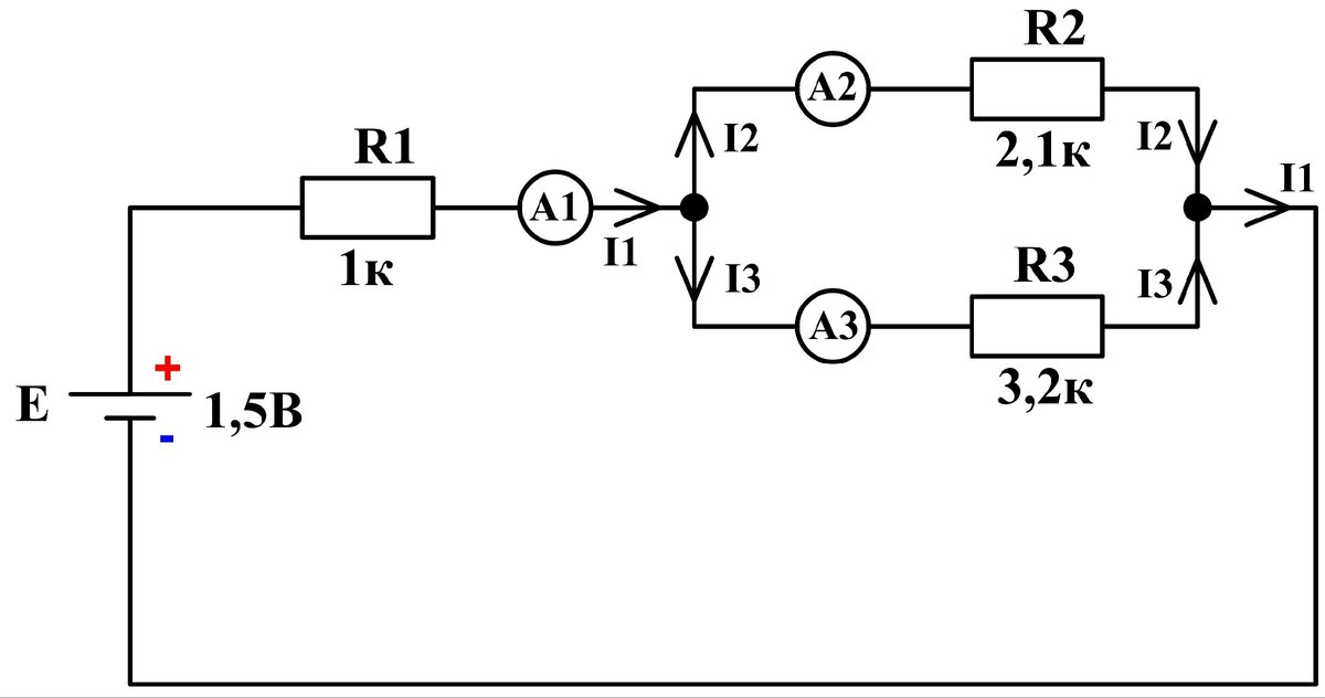 Первый закон Кирхгофа (закон токов Кирхгофа): алгебраическая сумма токов в любом узле любой цепи равна нулю (значения вытекающих токов берутся со знаком минус). Закон токов Кирхгофа следует из закона сохранения заряда: сколько тока втекает в узел, столько из него и вытекает. Если сложить показания трех амперметров с учетом знаков, то, согласно первому закону Кирхгофа, мы должны получить ноль: I1 — I2 — I3 = 0. Или показания первого амперметра А1 будет равняться сумме показаний второго А2 и третьего А3 амперметров. Второй закон Кирхгофа (закон напряжений Кирхгофа): алгебраическая сумма падений напряжений по любому замкнутому контуру цепи равна сумме ЭДС, действующих вдоль этого же контура. Если в контуре нет ЭДС, то суммарное падение напряжений равно нулю: для постоянных напряжений: для переменных напряжений: Иными словами, при обходе цепи по контуру, потенциал, изменяясь, возвращается к исходному значению. Частным случаем второго правила для цепи, состоящей из одного контур, является з
