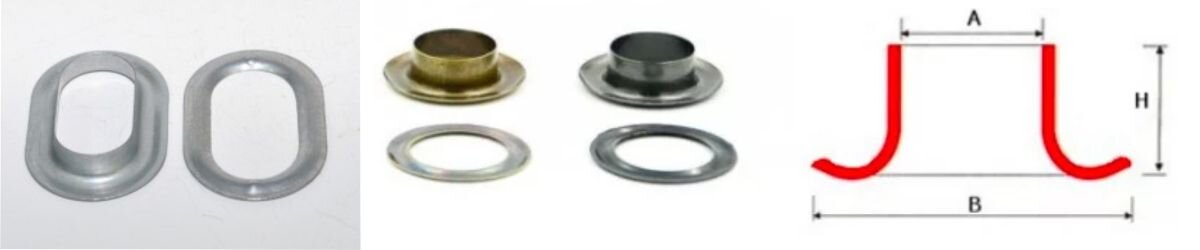 Люверс состоит из блочки и кольца. Основные характеристики- А-диаметр отверстия (обычно 10. 12. 16мм), В-наружный диаметр шляпки, Н-высота вытяжки у блочки, профиль формовки блочки и кольца.