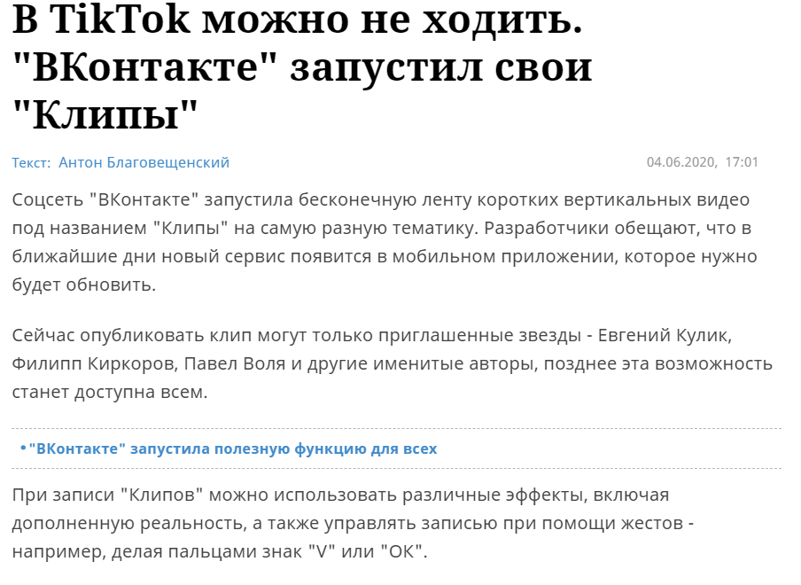 Новость дня. Вк неожиданно добавил тик ток как одну из функций. формально, конечно. Называется "клипы". Функционал тот же. Уже можно посмотреть сотни видео от блогеров, в ближайшем будущем, вероятно, сделают возможность записи клипов для всех. Но комментарии почему-то не наполнены восторженными отзывами. Можно найти петицию, где требуют запретить "тик ток вконтакте". Куча хэштегов по типу "вквамнетикток". Так что же произошло? И почему я в музыкальном канале об этом рассказываю?