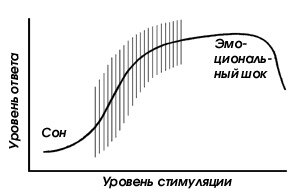 Если точно воспроизвести схему Фримена, то нельзя согласиться со способом выражения переменных, отложенных им на ординатах и особенно на абсциссах. Если принять его формулировку, которая объясняется общей концепцией автора, то окажется, что то, что мы назвали уровнем активации, будет просто энергетическим эффектом стимуляции. Эта узкобихевиористская точка зрения не согласуется с психологическими фактами и даже с данными нейрофизиологии, которые показывают, что стимуляция воздействует на ретикулярную формацию в зависимости от чувствительности субъекта.