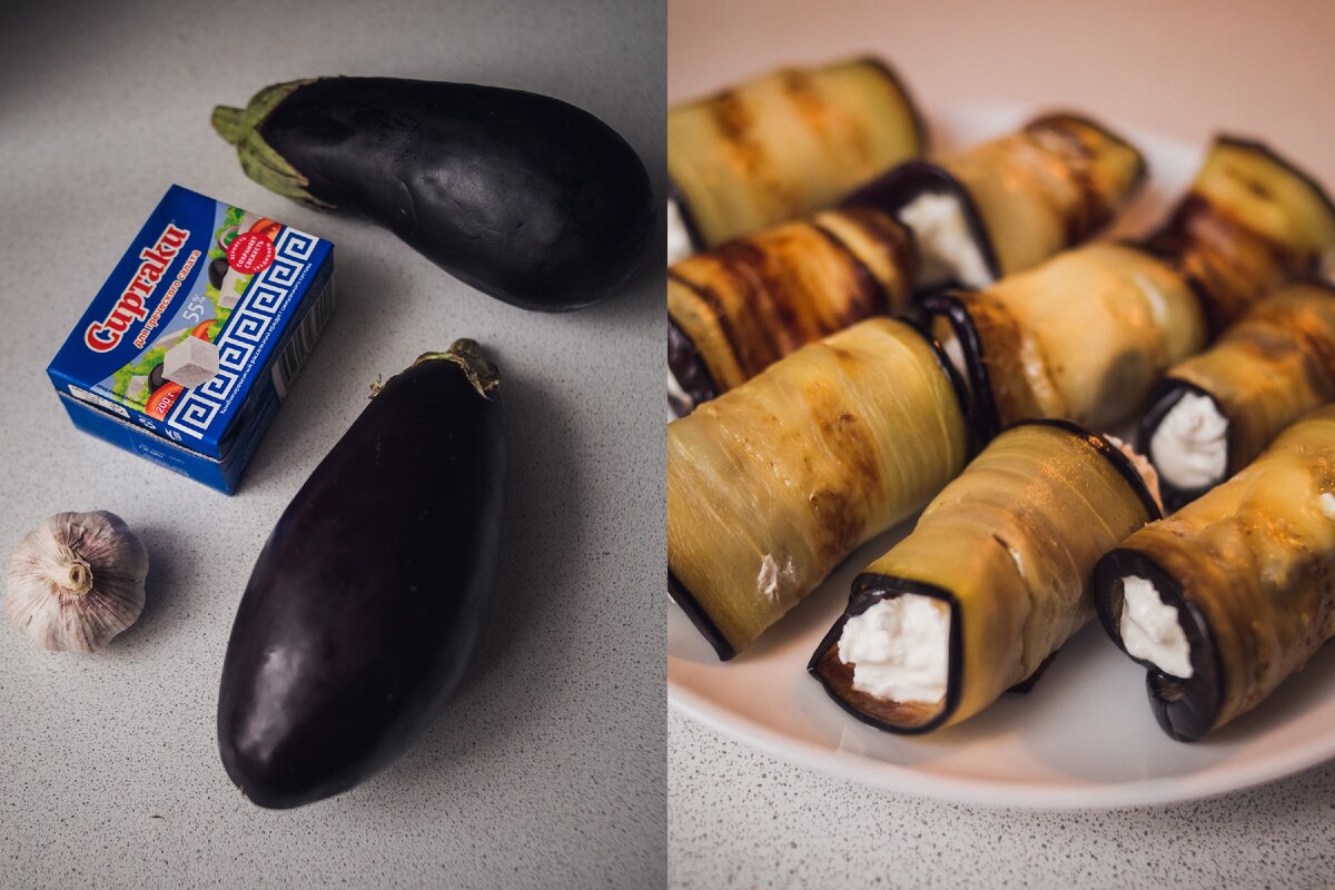 - На край полоски баклажана выложить начинку из сыра и свернуть рулетиком;