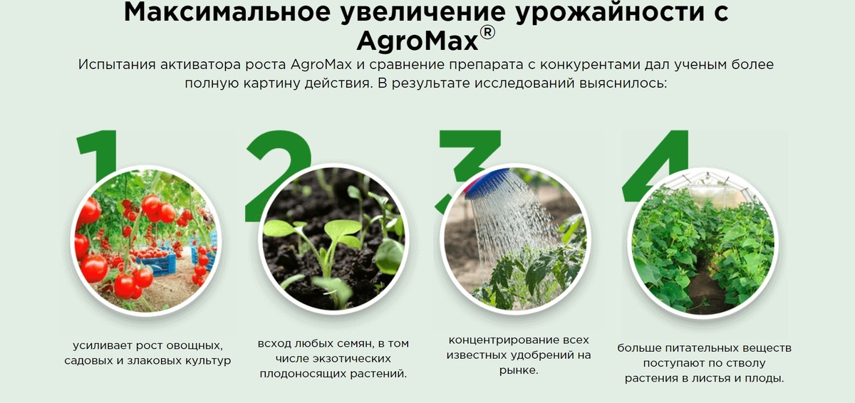 AgroMax - НА 50% БОЛЬШЕ УРОЖАЯ КАЖДЫЙ МЕСЯЦ AgroMax - универсальное удобрение для всех видов растений Активатор роста помогает растениям достигнуть максимальных размеров в короткие сроки. Усиленное питание корневой системы позволяет получить сочные, крупные плоды, обладающие удивительно приятными, сильными вкусовыми качествами. AgroMax - это: Удобрение «AgroMax» подходит для любых видов и сортов растений, оно особенно эффективно в выращивании “ранних” культур. Это инновационная разработка отечественных аграриев, которая открывает новые возможности в повышении урожайности для дачников и фермерских хозяйств. Спешите заказать AgroMax по специальной цене на официальном сайте! Предложение ограничено!