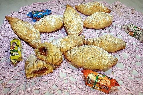 Слоёное тесто при запекании раскрывается, образуя у пирожков интересный рисунок. Тесто ароматное. Оно не мягкое, как у круассанов, а сухое и хрупкое.