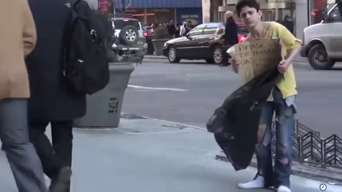 Жизнь, достаточно сложная штука и никогда не знаешь, что будет завтра. Она может бить прям об самое дно и независимо от того кем вы являетесь. На самом деле это был социальный эксперимент, который провели в Нью-Йорке. Холодным днём в минус 15 градусов, мальчик в одной футболке с табличкой в руках, где написано "Пожалуйста, помогите. Я бездомный и я голоден. Господь благословит вас", просил о помощи. Но никто не обращал внимания на мальчика. Никого даже не заботило, что мальчик слишком легко одет для такой погоды. Он всем видом показывал, что ему кроме как голодно, ещё и безумно холодно. В один момент к парню подошёл прохожий. Я было уже обрадовался, но как оказалось он просто не разобрал, что написано на табличке. Подробно прочитав, он продолжил свой путь. Спустя некоторое время парень вовсе околел и прилёг на землю укрывшись мусорным пакетом. Даже такой способ согреться на людей не оказывало никакого влияния. Некоторые прохожие останавливались, а потом продолжали свой путь не произнос