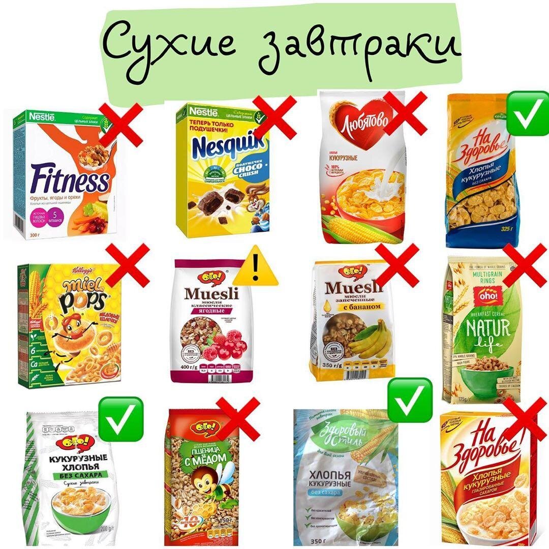 К сожалению, 80% сухих завтраков (особенно с названием «фитнес») содержат консерванты и большое количество сахара. ⠀ Важно изучать состав перед покупкой и выбирать хлопья с минимальным количеством сахара. ⠀ А ВЫ ЗНАЛИ? ❗️В сутки рекомендуется употреблять не более 6 ч. ложек сахара❗️ ⠀ Ваш «полезный» завтрак вполне может оказаться десертом😅 ⠀ На картинке указаны популярные хлопья и мусли. Давайте посмотрим, сколько в них сахара. Все измерения в рассчете на 100г ☝🏻 Для наглядности, количество сахара указала в чайных ложках🥄🥄 ⠀ ❌ Хлопья «Fitness фрукты, ягоды, орехи» - 6,5 ч.л сахара ❌ Подушечки «Nesquik choco crush» - 5 ч.л сахара ❌ Хлопья «Любятово кукурузные» - 4 ч.л сахара ✅ Хлопья кукурузные «На здоровье» без сахара ❌ «Miel pops» колечки - 7,5 ч.л сахара ⚠️ Мюсли «ОГО классические ягодные» - Сахара минимальное количество (содержится только в добавленных цукатах и кукурузных хлопьях) ❌ Мюсли «ОГО запеченные с бананом» - 4 ч.л сахара ❌ Овсяные колечки «Natur life» - 3,5 ч.л сахар