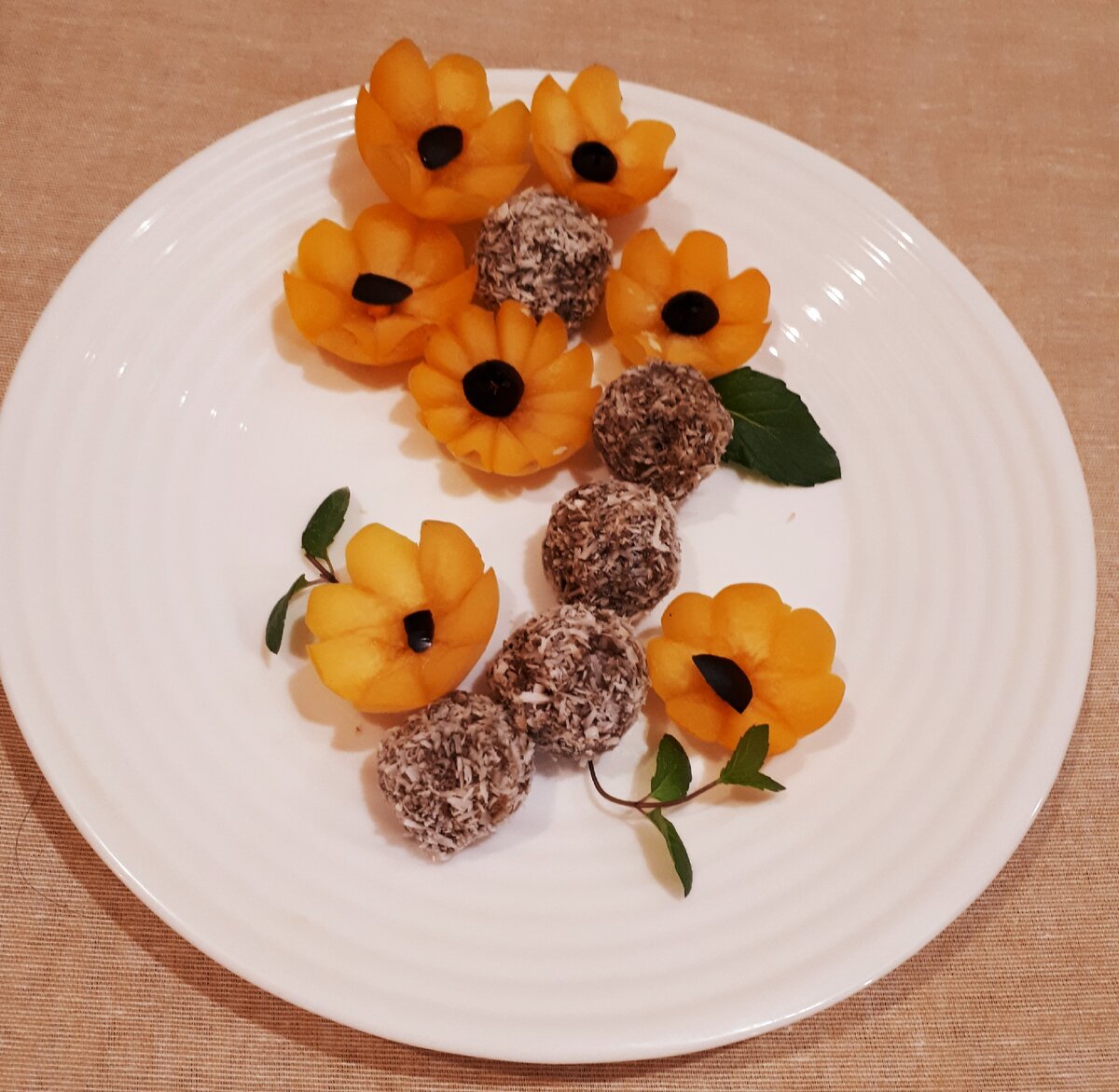 Лето, все на каникулах, кто-то едет на море, так как потихоньку ограничения снимают, кто-то ещё сидит дома. Магазинах уже начали продавать свежие ягоды и каждая семья старается покупать их для своих детей. Просто помыть и поставить на стол , конечно, хорошо, но дети любят, когда красиво выложено все на тарелках. Сегодня я покажу несколько видов оформления абрикоса. Из абрикоса вырезаем вот такие нежные цветочки, а рядом выкладываем конфеты, сделанные своими руками и ставим листья мяты. На конфеты идут такие продукты: Все продукты перекручиваем через мясорубку, добавляем столовую ложку меда, хорошо ещё раз перемешиваем и формируем шарики. Далее обваляем в кокосовой стружке, можно с кунжутом, выкладываем в контейнер и ставим в холодильник. Можно есть сразу с чаем, или с кофе без сахара, очень вкусные и полезные. На этой картине рядом выложила печенье домашнее, нарезанное пластинами. На этой картине на абрикосы выложила с помощью корнетика из бумаги взбитый крем, сразу меняется внешний в