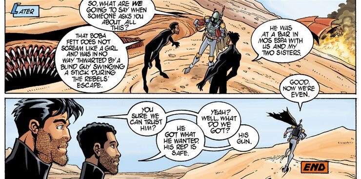 Несмотря на свое ограниченное экранное время, Боба Фетт остается одним из самых популярных персонажей «Звездных войн». Его смерть в сражении с джедаеем привела к нескольким неофициальным историям, описывающим его выживание, но одна из них почти так же унизительна, как и его смерть. Тег и Бринк — это пара повстанческих бойцов, которые появляются в нескольких одноименных комедийных комиксах, которые являются неканоническими историями даже в пределах континуумов, ныне называемых легендами. Исполняя роль Розенкранца и Гильденстерна саги, они невежественные идиоты, присутствующие и комментирующие основные события саги, не будучи активной частью их, а также несущественно встречающиеся со значительными персонажами серии. Они сталкиваются с Бобой Феттом на Татуине, который решает отомстить за предыдущее унижение, когда они украли топливо с корабля, случайно вырубив его в короткой перестрелке. Охотник за головами усмиряет их, привязывает к шесту и пинает в яму Сарлакка, только чтобы они снова