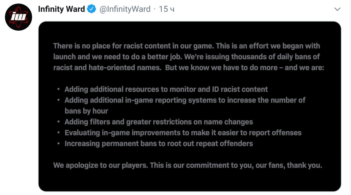 В Call od Duty: Modern Warfare обещают пристальнее следить за расисткими высказываниями игроков. "В нашей игре не место расистскому контенту. Мы начали бороться с ним с релиза, но нам необходимо делать эту работу лучше. Каждый день мы раздаём тысячи банов за имена, разжигающие расизм или ненависть. Но мы знаем, что нужно делать больше. Мы займёмся следующим: • Добавим больше ресурсов для мониторинга и отлова расистского контента. • Добавим дополнительные внутриигровые системы жалоб, чтобы увеличить количество банов в час. • Добавим фильтры и усилим ограничения на смену имени. • Рассмотрим внутриигровые улучшения, которые позволят упростить подачу жалоб. • Увеличим количество перманентных банов, чтобы искоренить злостных нарушителей. Мы приносим извинения игрокам. Мы делаем это ради вас, наших поклонников. Спасибо."