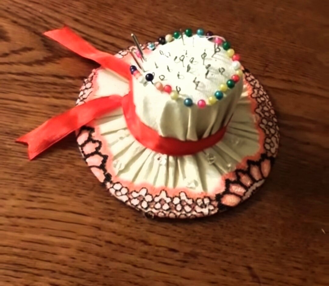 Как сделать красивую игольницу своими руками без особых усилий Что такое игольница и для чего она нужна? Игольница это- футляр или подушечка для иголок и булавок. Используется для их хранения и исключает возможность потери иголок или булавок во время швейных работ. Вот поэтому такая на первый взгляд не значительная, но очень нужна вещь нужна в каждом доме. На сегодняшний день существуют огромное количество разнообразных игольниц. Они отличаются друг от друга формами, размерами, материалами из которых сделаны и т.д. Для изготовления этой игольницы нам понадобятся: картон, остатки тканей, ленточка, бусины,... и ХОРОШЕЕ настроение;)) Для изготовления основания шляпки-игольници сначала надо на картоне начертить круг. У меня круг 11.5 см. Вырезаем. Переносим этот круг на ткань и откладываем от края ткани 4.5 см. для того чтобы начертить круг большего диаметра. Вырезаем круг большего диаметра. Теперь порокладывам на ткани строчку " стежок через край". ( смотрите видео) после этого вк