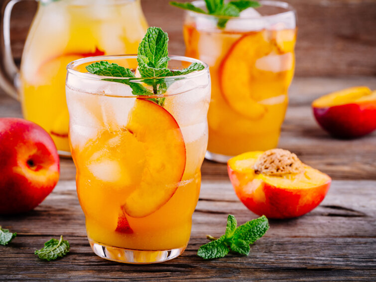 Из цитрусовых фруктов, персиков и мяты рекомендуется приготовить вкусный, очень полезный лимонад, а подавать его можно с кубиками льда.