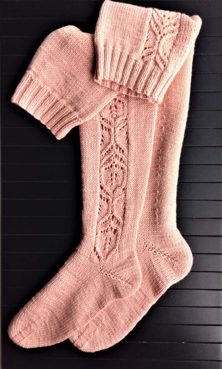 Набираем 88 п. и распределяем их поровну на спицах, по 44 п. Вяжем резинкой 2х2 17 круговых рядов. На первой спице перед 5-тью крайними петлями отсчитываем 12 п. для ажурного узора. Переходим на вязание лицевой гладью и узором. Вяжем 57 круговых рядов, после чего начинаем делать убавления. Для убавок на второй спице отмечаем маркерами 10 п. перед 6-тью крайними петлями кругового ряда. Убавки делаем, провязывая две петли вместе перед маркерами с правой стороны с наклоном вправо, с левой — влево. Убавки: 5 раза в каждом 8 круг. ряду; 5 раз в каждом 6 круг. ряду; 6 раз в каждом 4 круг. р. На спицах остаётся 56 петель ( по 28 п. на каждой), вяжем ещё пару круговых ряда, чтобы у узора было «логическое» завершение. После чего переходим к пятке.