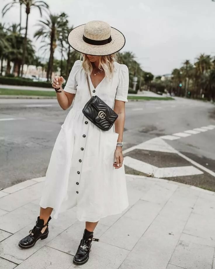 Привет! Как вам такой вариант для лета? Сочетание нежного белого платья с чёрными грубыми ботинками, ботинки я заменила на босоножки на платформе. Сделала подборку одежды из h&m Белое платье просто великолепно, цена 2999 руб. Повтори образ (все вещи из h&m) 1. Босоножки на платформе, 1839 руб., арт.0859176001 2. Платье из смесового лиоцелла , 2999 руб., арт. 0889344001 3. Маленькая сумочка на плечо, 1199 руб., арт.0883684001 4. Соломенная шляпа, 999 руб., арт.0691704002 5. Колье с подвесками, 799 руб., арт.0910248001