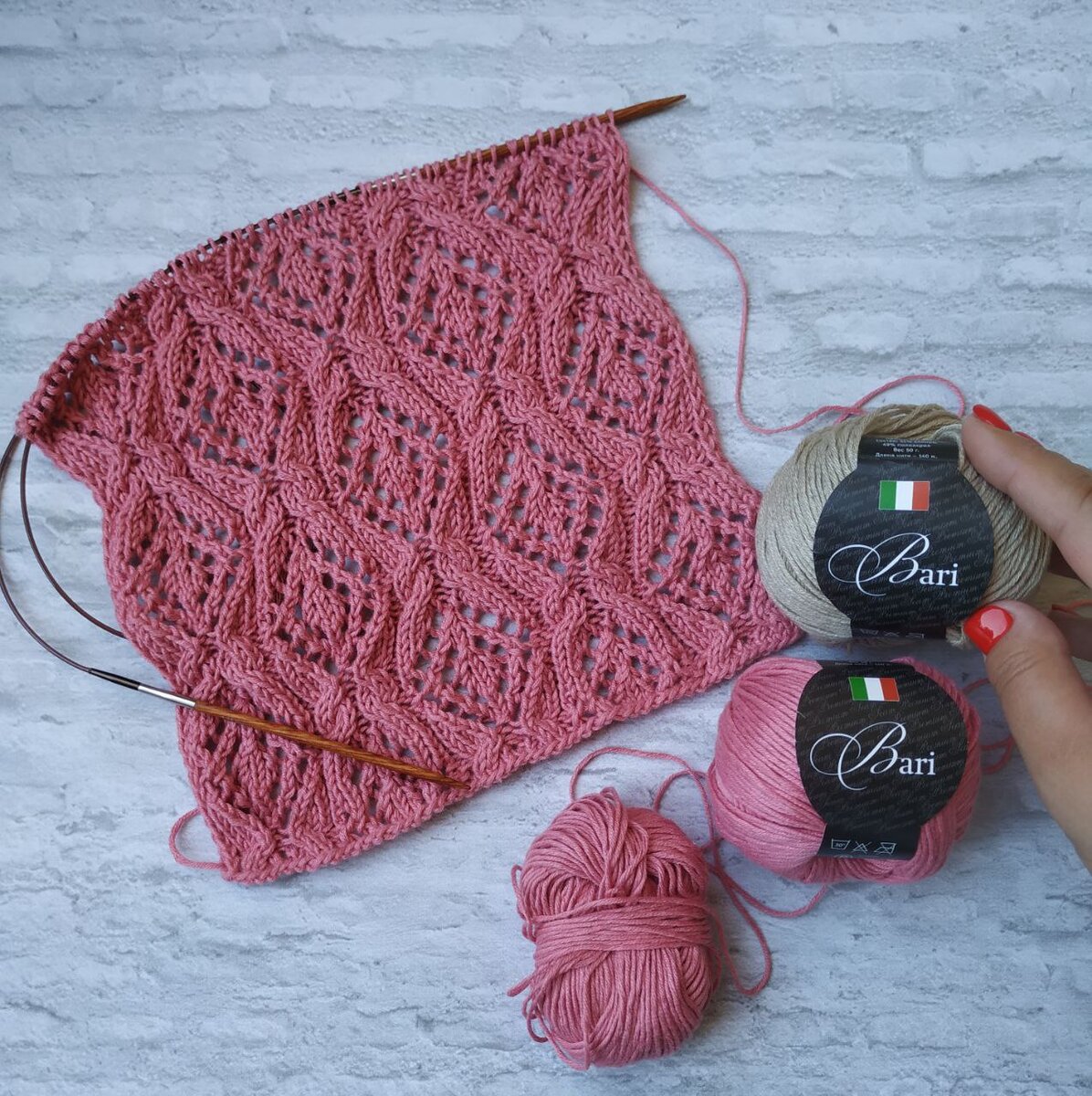 Образец связан спицами номер 3,75 из пряжи БАРИ от Сеам. Это полухлопок, 140м/50г. Очень мягкая, приятная ниточка. Отлично подойдет для вязания летних и демисезонных изделий.