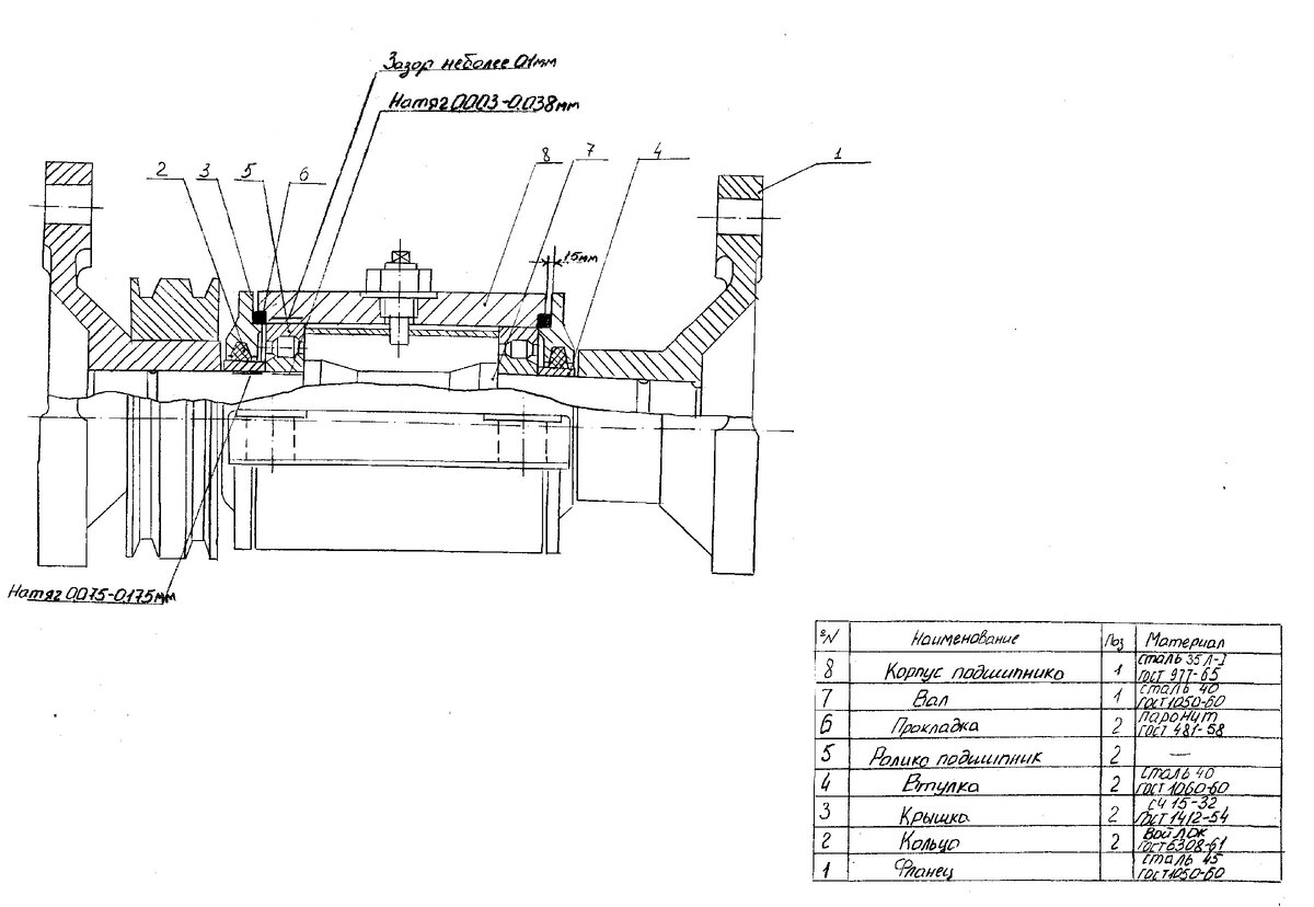 1. Разборка промежуточной опоры. Спрессовываем фланцы кардана. Снимаем крышки . Вынимаем вал вместе с подшипником втулкой. Втулку с подшипниками спрессовываем при необходимости ремонта вала или ослабление посадки подшипников. 2. Очистка промежуточной опоры. Промыть все детали кроме сальников чистом осветительном керосине. 3. Ремонт подшипников промежуточной опоры. Подшипники осмотреть, при необходимости заменить. Оставляем без исправлений для дальнейшей эксплуатации при наличии следующих дефектов: (царапины и риски на посадочных поверхностях наружного и внутреннего колец подшипников, проявляющие в следствии слабой посадки подшипников; забоины, вмятины и следы коррозии на сепараторе, не препятствующие нормальному движению шариков; матовая поверхность шариков и беговых дорожек в следствии нормального износа; выработка торца наружного или внутреннего кольца шарикоподшипника на глубину до 0,3 мм (при сборе подшипник устанавливаем обратной стороной))