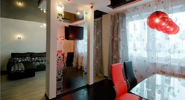 Система освещения состоит из большой люстры, настенных бра над диваном и точечных светильников, встроенных в перегородку и над гардеробной комнатой. Учитывая, что глянцевый потолок еще и отражает свет, такой подсветки вполне достаточно.