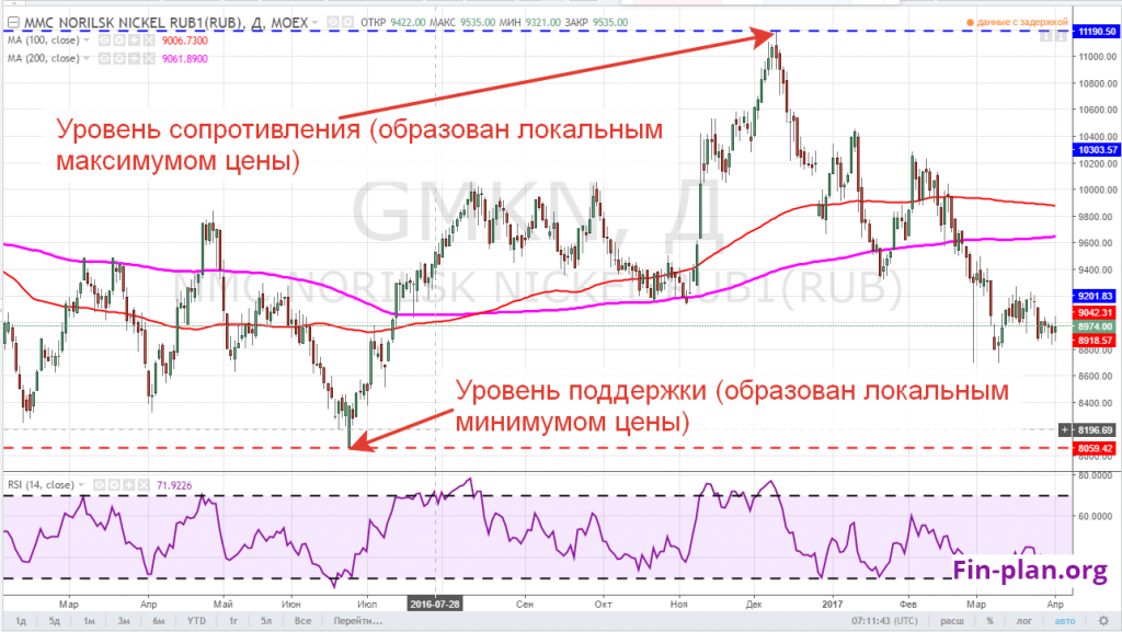 Если цена какое-то время снижалась и затем остановилась в определенной точке, в которой как раз и установился баланс спроса и предложения, то мы говорим о том, что цена достигла уровня поддержки. Если цена росла и при этом остановилась в определенной точке, в которой снова установился баланс спроса и предложения - то мы говорим, что цена достигла уровня сопротивления.