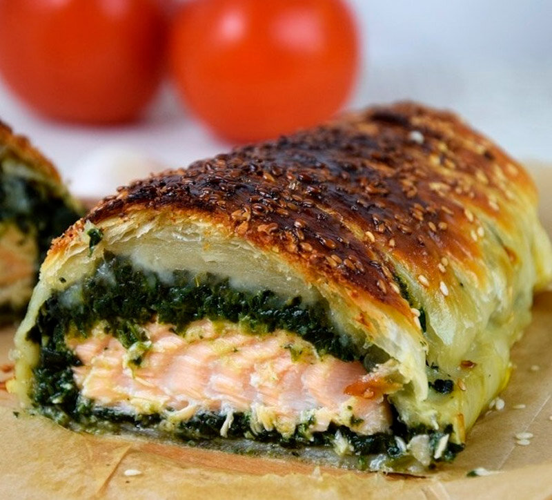 Лосось в слоеном тесте - это одно из моих любимых блюд. Лосось окутан шпинатом и сыром моцарелла... Праздник для гурманов! Достаточно 30 минут, чтобы создать это вкусное и очень простое блюдо. Ингредиенты: 1 упаковка слоеного теста; 400 гр. лосося; 500 гр. нарезанного шпината; 10 гр. сыра моцарелла; небольшая горсть кунжута; 2 столовые ложки растительного масла; соль, перец. Приготовление лосося: Духовку нагреваю до температуры 190 градусов. На сковороде обжариваю шпинат с добавлением 1 ст. ложки растительного масла, а также щепотки перца и соли. Минутку жарю, чтобы выпарился сок из шпината. Слоеное тесто делю на две равные части, в центр каждой кладу филе лосося покрытое обжаренным шпинатом, верх украшаю тертым на терке сыром, посыпаю щепоткой соли и перца. Края теста режу полосками, как показано на фото и складываю полоски по очереди, соединяя их по центру лосося. Верх теста слегка смазываю 1 ст.л. растительного масла или взбитым яйцом и посыпаю кунжутом. Запекаю около 20-25 минут