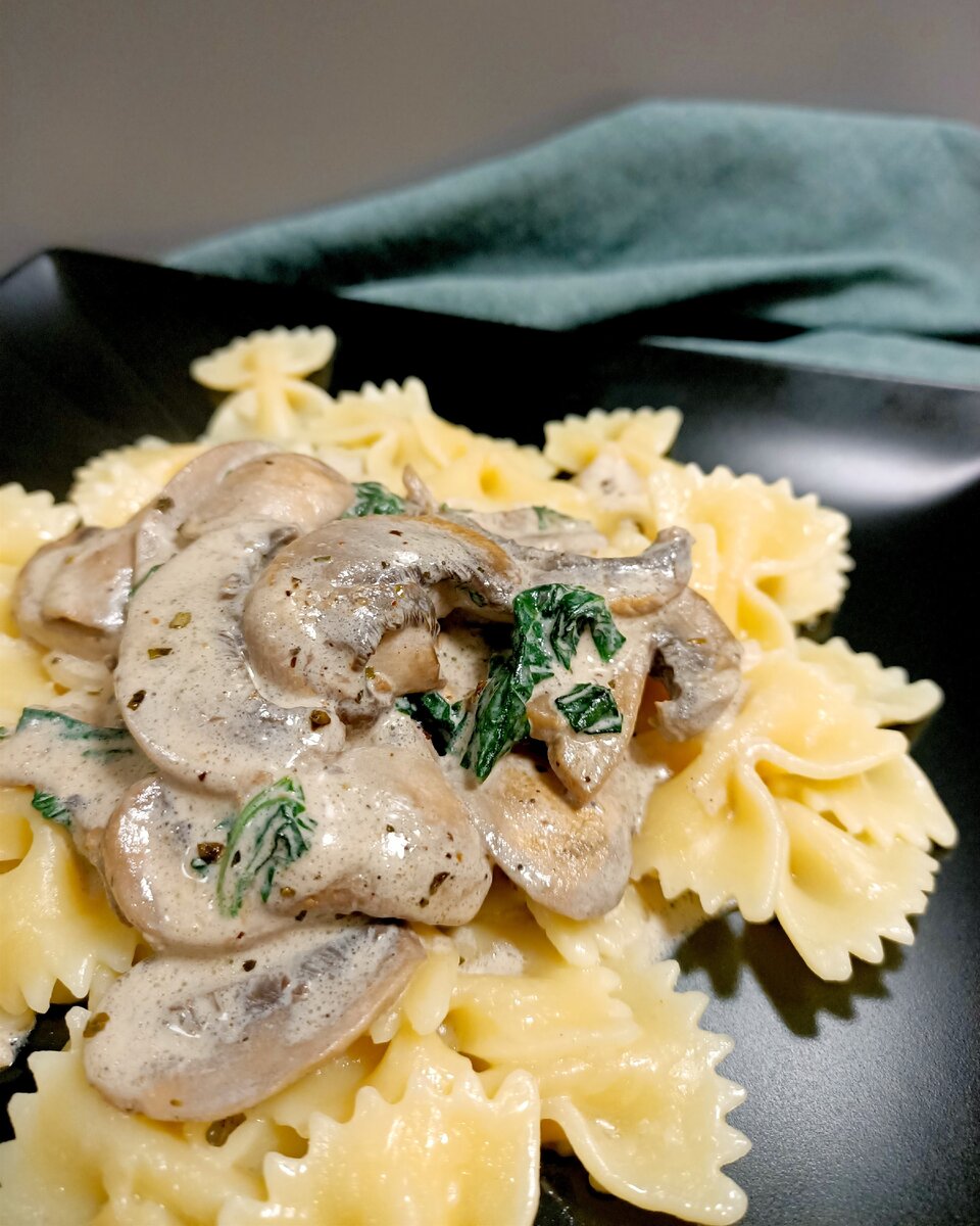 Паста с чесночно-грибным соусом. У меня как обычно быстро, просто и вкусно ☺️ *** Ингредиенты: Паста Грибы 300 г Чеснок 2 зуб Шпинат 10 вет. Сливки 20% - 100мл Соль, перец по вкусу *** Приготовление: Пасту варим согласно инструкции. Грибы нарезаем пластинами, отправляем на сухую разогретую сковороду. Когда грибы хорошо выделили сок, добавляем нарезанный пластинами чеснок, немного растит.масла. Жарим 4 мин. Добавляем листья шпината, перемешиваем, вливаем сливки, соль, перец. Буквально 1 мин. И соус начинает густеть, снимаем. Сочные грибочки отлично сочетаются с пастой👍