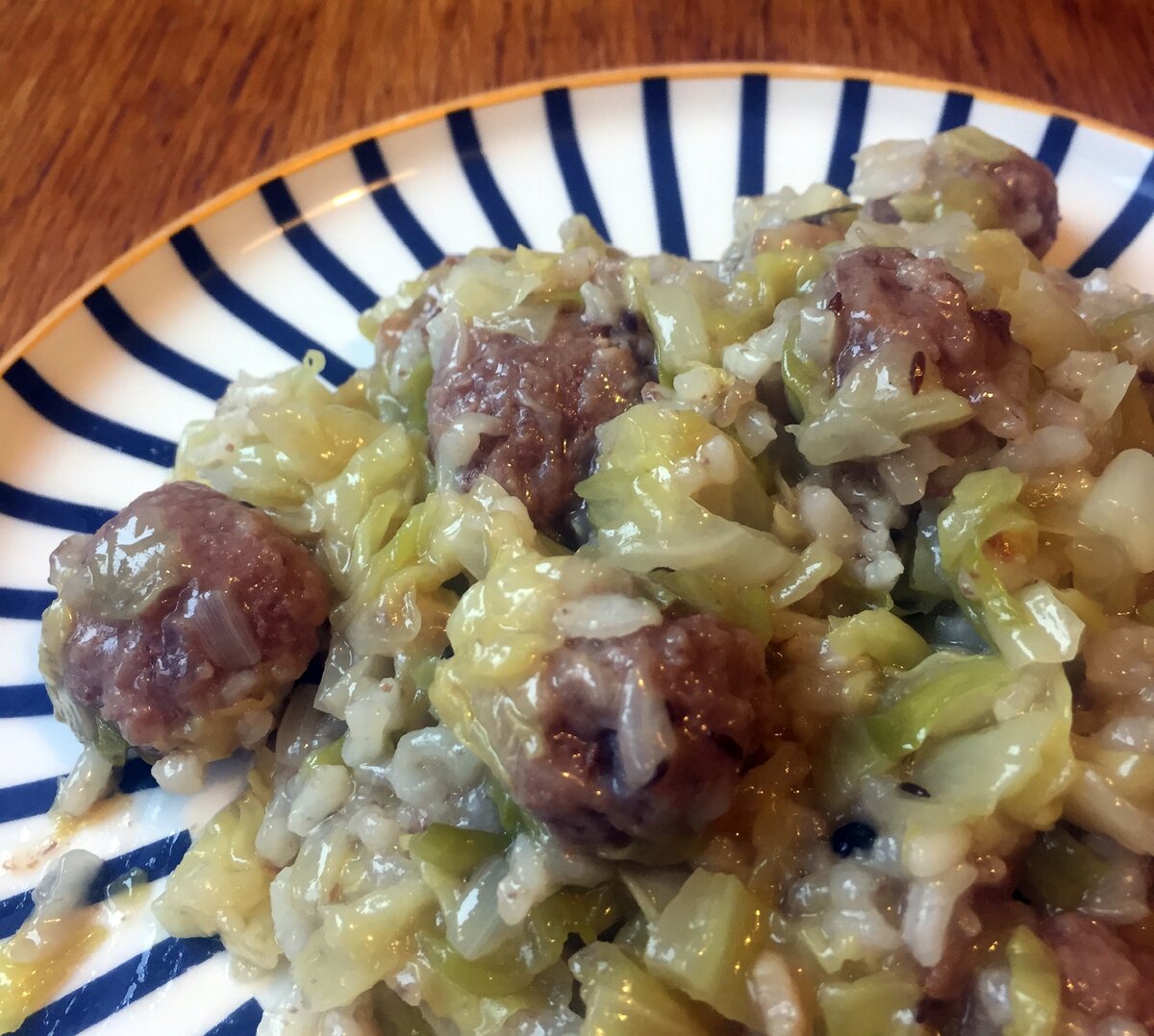 Поверх риса с капустой выложим наши мини-тефтельки, состоящие из одного фарша - я совсем ничего в них не добавляю. Они достаточно мелкие, чтобы им хватило соли и других вкусов из окружающей их среды.