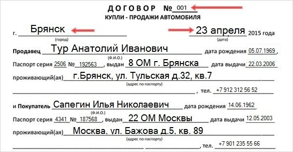 Скачать пример заполнения бланка договора купли продажи автомобиля