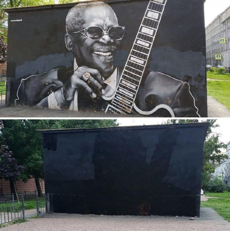 Что ж дорогие друзья, последние новости "Граффити в Петербурге". На Греческом проспекте , в центре за БКЗ , так где раньше располагался великий музыкант Би Би Кинг, красуется новое граффити. Увы, Би Би стал очередной жертвой коммунальщиков. Но ребята из HoodGraff ничего не боятся. 28 мая там появился динозавр с трубкой и в костюме. "Zasidelis: Питерюрский период". И правда, ну сколько можно уже сидеть, хотя город уже ожил, и это радует. Идём дальше, вы слышали скорее всего о закрашенном граффити с изображением Бродского? Я не понимаю, почему у нас в стране затхлые советские люди, по-прежнему считающие любое проявление адекватного творчества вандализмом, никак не могут принять современные реалии. Ведь видно, что изображение не ради прикола. Хотя, Бродский покинул Россию, может это флешбековая ненависть. Это огромные шаги назад. Такими темпами, не видать нам креатива ещё тонну-тонну лет. А вот ребята из "Ситимобил" молодцы. Очень быстро сообразили и дали свою ответочку, за которую и