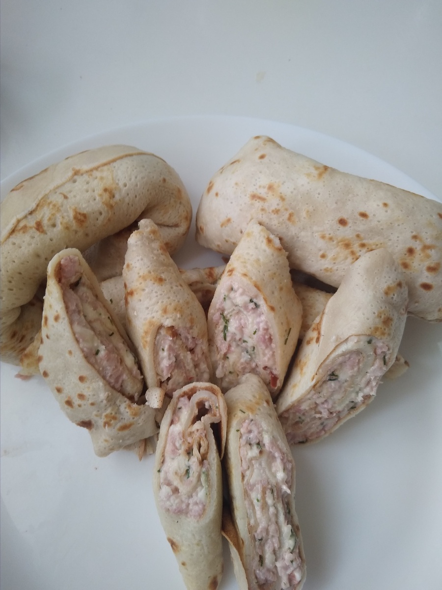 Ингредиенты: Для блинов: Молоко - 0,5л Мука - 1,5 стакана Яйца - 2 шт Подсолнечное масло - 1 столовая ложка Сода - 1/3 чайной ложки Соль Для начинки: Ветчина - 200 г Сыр - 100г ( можно плавленный) Чеснок - ( по вкусу) Зелень ( укроп, петрушка, кинза) по желанию Майонез - 50 г Приготовление: В молоко добавить яйца, подсолнечное масло, соду, соль и сахар, размешать. Всыпать просеянную муку и взбить венчиком, чтобы не было комков. Сковороду разогреть, слегка смазать подсолнечным маслом (только для первого блина) и выпекать блины. Для начинки ветчину, сыр, чеснок, зелень пропустить через мясорубку. Добавить майонез, перемешать. Начинку намазать на блин. Блин свернуть трубочкой, нарезать наискосок. Можно подавать со сметаной, кетчупом, разными соусами. Приятного аппетита!