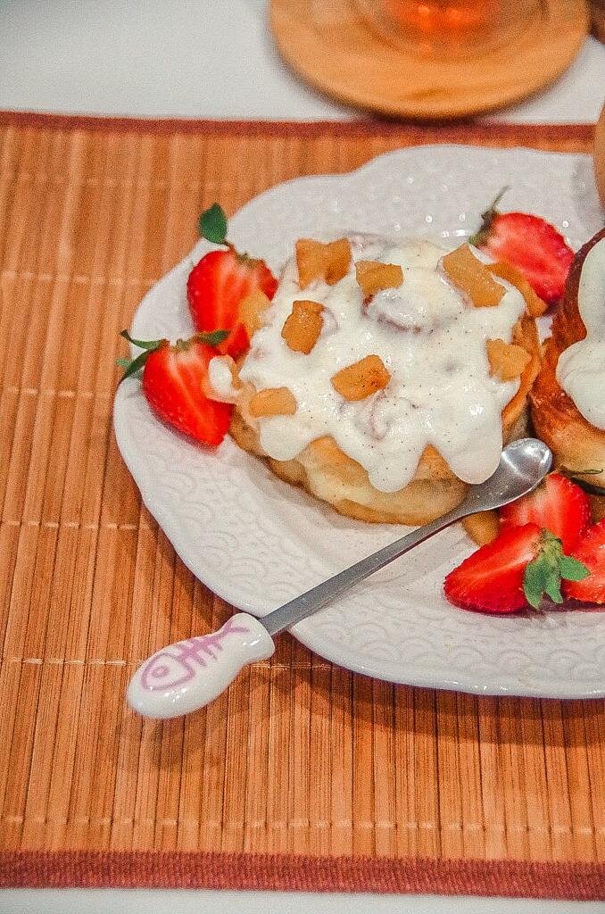Все ингредиенты для крема должны быть комнатной температуры. Смешав их в произвольном порядке, вы получите гладкий, красивый крем. К этому времени булочки тоже уже готовы. Нанесите крем на горячие ароматные завитки из теста. Хорошо распределите его так, чтобы он немного попал в прожилки яблочной начинки. Внизу булочек вас будет ждать вкусный и яркий бонус. Яблочный сок с сахаром опустятся в основание лакомства и образуют потрясающую карамельную корочку! Не буду описывать, насколько ошеломляющим становится сочетание карамели, горячего сдобного теста, кисло-сладкой коричной начинки и сливочного крема. Оставим эту небольшую интригу на суд каждого.