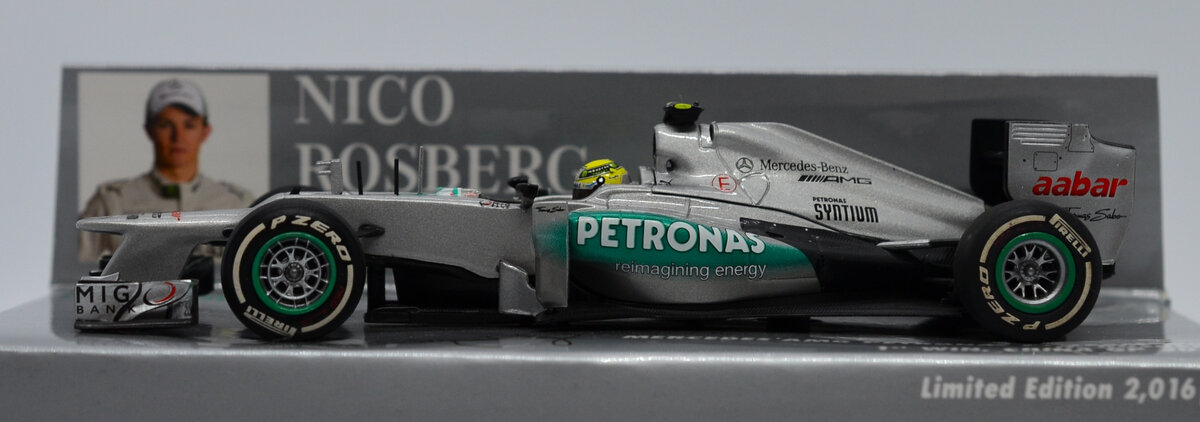 Здравствуйте, дорогие читатели! Это двенадцатая статья на канале Заметки Формулы 1:43, и в ней мы рассмотрим модель Minichamps - Mercedes AMG Petronas F1 Team W03 - N. Rosberg - 1st Win China GP 2012. Общий вид болида Mercedes W03 (фото 1, фото 2). Модель выпущена в марте (10-я неделя) 2013 года ограниченным тиражом в количестве 2016 шт. в масштабе 1:43, в стандартном пластиковом боксе (14,3х7,3х4,2 мм). Подставка оформлена в командных цветах "серебряных стрел" Mercedes AMG F1 Team с автографом Нико Росберга. Номер модели по каталогу - 410120108. Модель, в основном, изготовлена из металла. Днище, подвеска, антикрылья, дефлекторы, колесные диски выполнены из пластика. Шины резиновые с маркировкой Pirelli P ZERO, также на шинах присутствует маркировка принадлежности комплекта пилоту. На днище и подвеске присутствует имитация карбона. Модель, в том числе ливрея и декали, соответствует гран-при Китая 2012 года, на котором Нико Росберг завоевал свою первую победу в гран-при Формулы 1. В