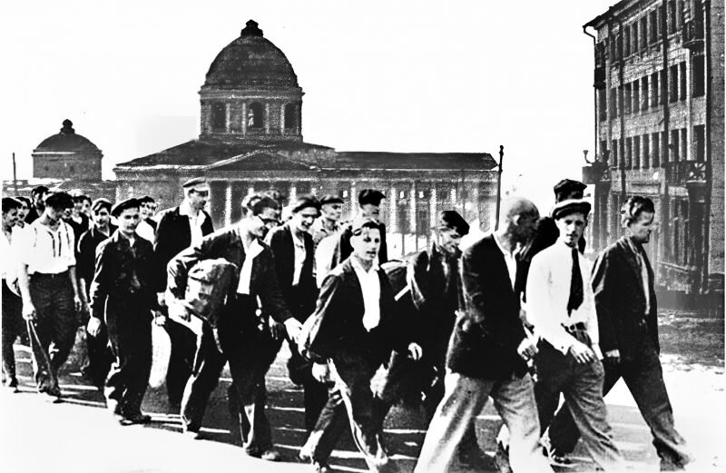 На площади Перекальского новобранцы высыпали из вагона и снова построились в колонну.