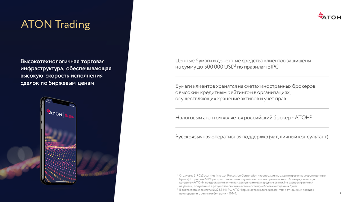 - Инвесторы, торгующие через ATON Trading, являются клиентами российского брокера. АТОН становится для них налоговым агентом. Это важно по следующей причине: с 1 января этого года владельцы зарубежных банковских и брокерских счетов обязаны декларировать их в ФНС, самостоятельно рассчитывать и уплачивать налог в российский бюджет. В случае с ATON Trading все эти функции берет на себя АТОН. Отчитываться в налоговую не нужно, потому что пользователи ATON Trading – клиенты российского брокера. Помимо прочего, АТОН – один из немногих участников российского рынка, который обладает статусом Qualified Intermediary, позволяющим инвесторам получать льготную ставку налогообложения. Если у вашего брокера нет такого статуса и вы инвестируете в американские акции, то у вас может быть удержан налог в размере 30%. Инвестируя с нами и получая доход в виде дивидендов, в США у вас удержат только 10% по акциям и лишь 3% вам придется доплатить в российскую налоговую. Мы сами рассчитываем и уплачиваем НДФЛ в бюджет.