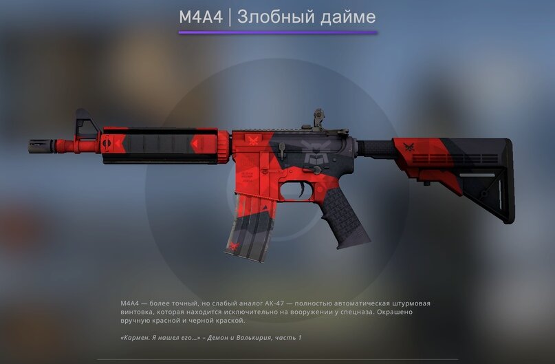 М4А4 это автоматическая винтовка из игры Counter strike:Global offensive. Этот оружие зарекомендовало себя как альтернатива небезызвестного AK-47. M4A4 отличается от автомата стороны атаки большей точностью и более простым контролем отдачи, но у автомата спецназа меньший урон и из за этого игроки предпочитают подбирать вышеупомянутый АК-47. Если вы попали на эту страницу вы наверняка ищите ответ на вопрос "Какую м-ку купить если я не хочу тратить десятки долларов на пиксели в игре. Я расставил раскраски на автоматы в порядке топа, но имейте ввиду, каждая винтовка из этого топа по-своему красива и уникальна.Цены могут изменяться с течением времени. 1.M4A4 "Злобный дайме" Эта винтовка пришла в игру из коллекции "Фальшион". На корпусе преобладают красные и черные цвета которые создают ломаные линии подчеркивающие определенные части оружия.На прикладе и на магазине расположены два самурайских меча(но вы их будете замечать не часто так как они не особо большие). На этот кольт имеет смысл ис