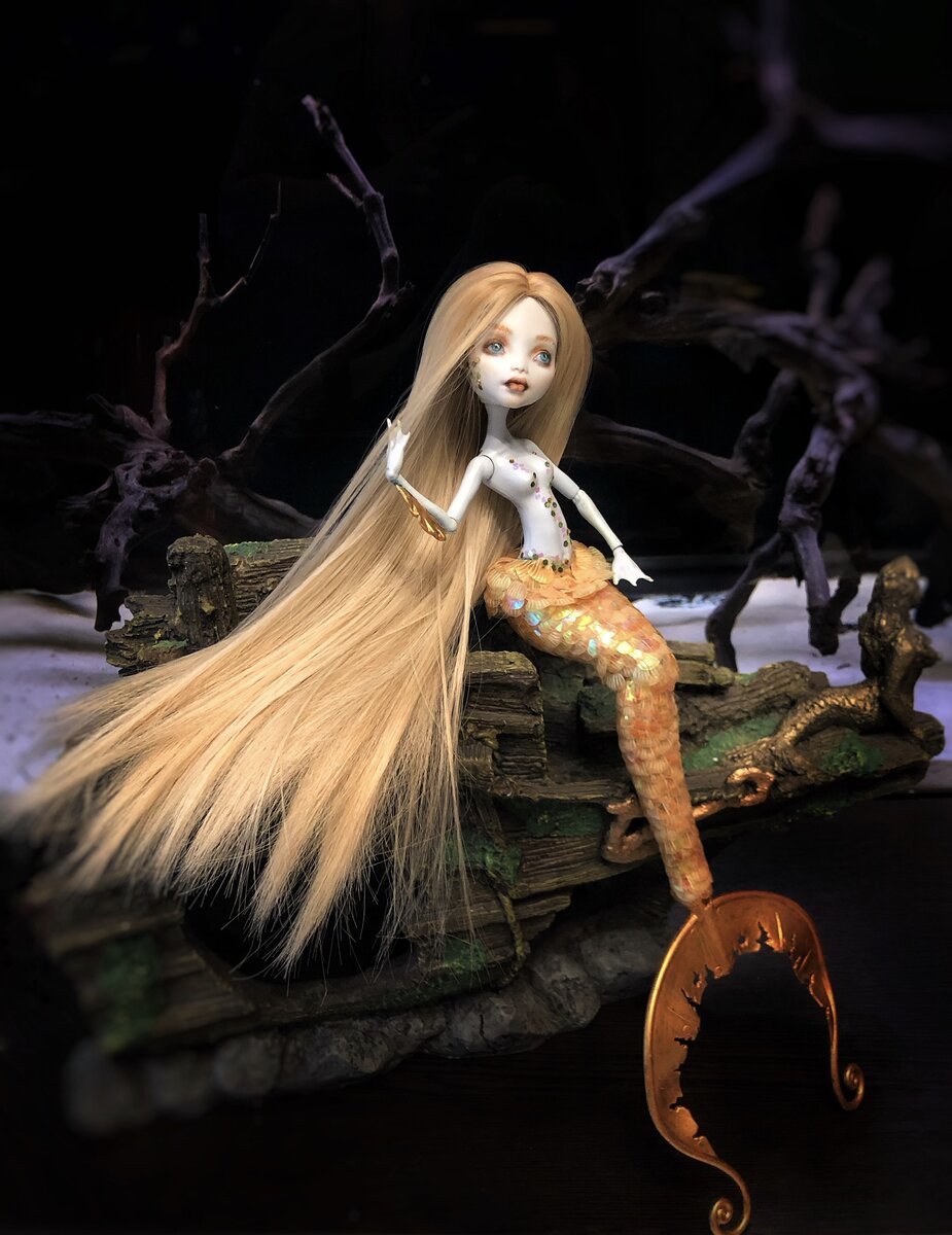 Мне очень приятно продолжить своё повествование о моей кукольной русалке, над которой я работаю в рамках коллаборации мастеров на тему ‘Сказки’. Подробнее о том, как зарождалась эта работа, вы можете прочесть в статье: Коллаборация кукольных мастеров. Смогу ли я? В прошлой статье я остановилась на работе над хвостиком. Отсюда и продолжу. Оригинальный синий цвет хвостика, мне не подходил. Поэтому я выкрасила его в золотой цвет, с помощью акриловой краски. Главный тюнинг хвостика заключается в его обделывании чешуей. Долгий и кропотливый труд. Каждую чашуйку я приклеивала на клей момент, внахлест друг на друга. Таким образом чашуйки дердат сами себя. Обладаю уникальной способностью - так увлечься работой и не сделать достойного фото. Прошу меня извинить за это. И пусть это не самое лучшее в мире фото, но для меня оно значит много. Для меня - это несколько часов мелкой работы, периодическое приклеивание рук к куколке в области хвостика и океан