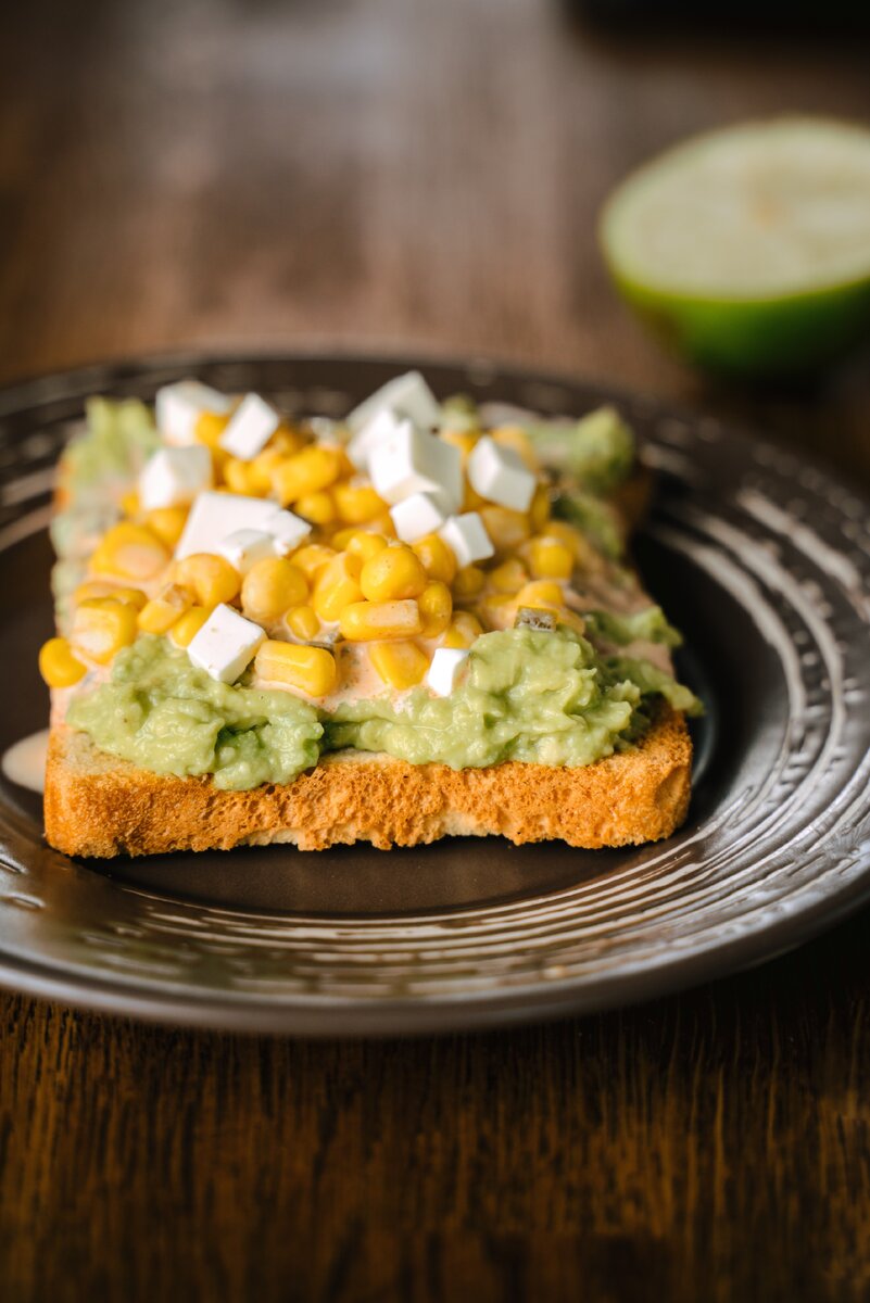 Тост с авокадо, маринованным халапеньо и кукурузой
