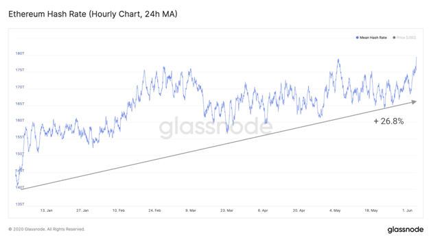 Скорость хэширования в сети Ethereum с начала года выросла на 28,6% - это самый высокий уровень за 7 месяцев; быки стремятся подтолкнуть цены к уровням, которые в последний раз наблюдались в феврале. Согласно данным аналитической платформы Glassnode, скорость хэширования Ethereum является самой высокой с конца 2019 года. Ethereum использует механизм консенсуса PoW, иными словами майнинг для создания нового ETH с помощью вычислительной мощности. Пока сеть готовится к переходу на алгоритм консенсуса Proof-of-Stake (PoS), посредством обновления до парадигмы Eth 2.0 позднее в этом году, ожидаемого майнеры продолжают соревноваться в разгадывании криптографических головоломок. Согласно Etherscan.io, скорость хэширования за последние 12 часов составляла 183'128,76 гигахэшей в секунду (GH/s). Рост хэшрейта Ethereum за 2020 год. Источник: Glassnode