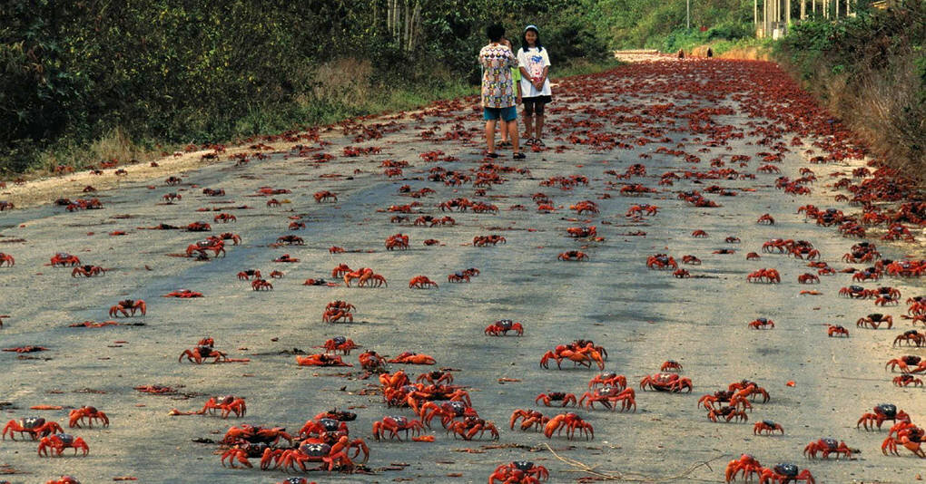 Красные земляные крабы по праву считаются изюминкой острова Рождества, который находится в Индийском океане, близ Австралии. Численность крабов на этом острове достигает 120 млн. Красные крабы живут только на суше. Но во время сезонных миграций (обычно это около 10 дней), миллионы земляных крабов отправляются к побережью, чтобы отметать икру. В этот период остров превращается в огненные потоки, а движение транспорта на дорогах сводится к минимуму и даже прекращается. Это удивительное зрелище привлекает внимание экологов и фотографов со всего мира.