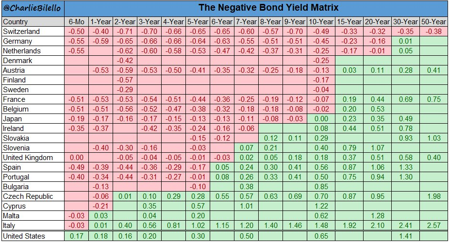 1. ПОПС наступает: ставки по государственным облигациям многих стран уже в отрицательной зоне. Вы даёте в долг миллион евро, а вам возвращают через год 993 тысячи. На табличке такие облигации отмечены красным.