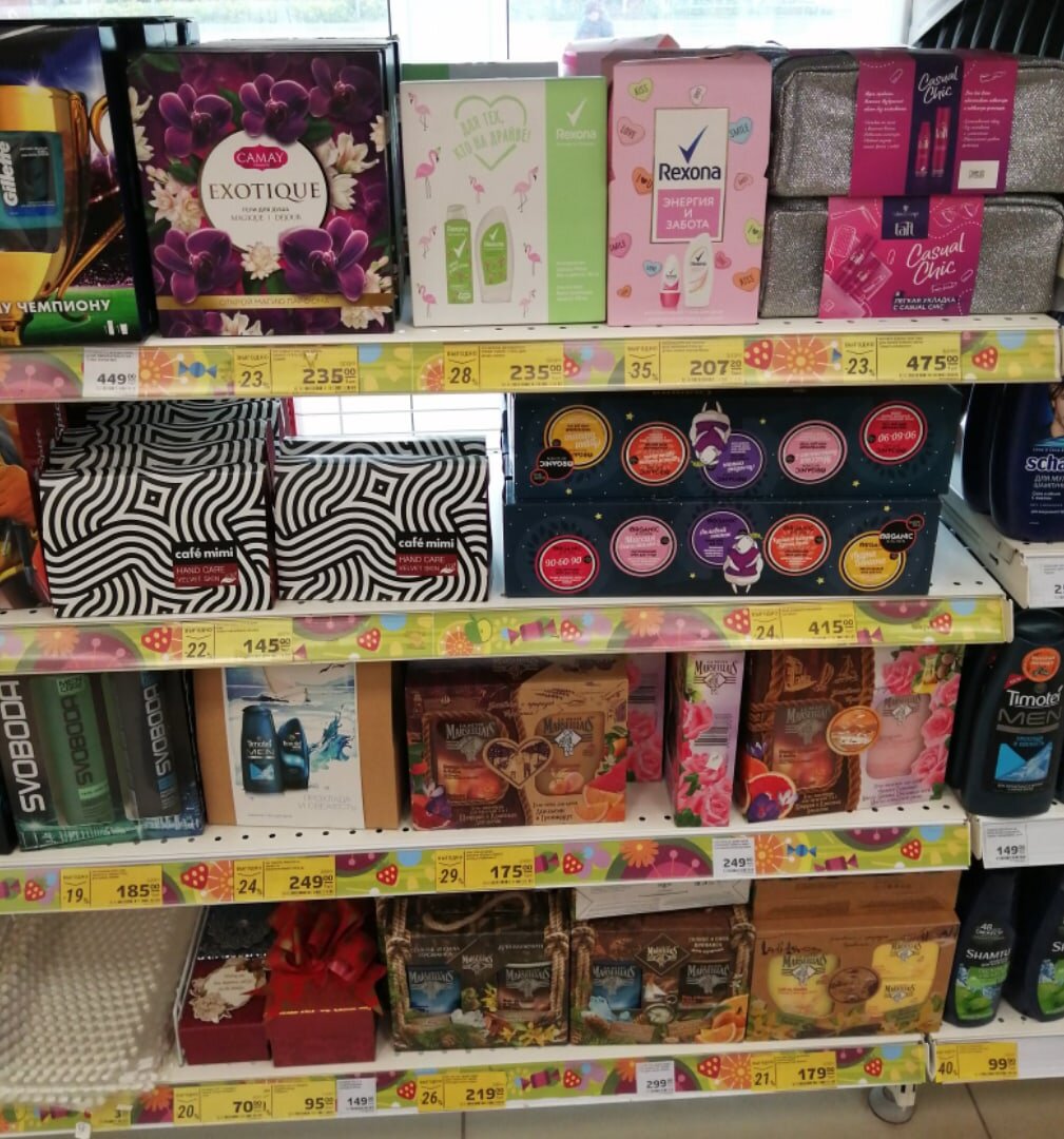 В Магнит Косметик много скидок на подарочные наборы, которые появились на прилавках в преддверии таких праздников как Международный женский день (8 марта) и День защитника Отечества (23 февраля). То, что не было раскуплено перед праздниками, теперь продается по неплохой скидке. Актуальные цены на 05.06.2020 В глаза сразу же бросаются подарочные коробки от Organic Kitchen, Rexona и Сamay. Среди них можно заметить и другие неплохие наборчики по выгодной цене. Желтые ценники можно увидеть на небольшие подарочные наборы от Dove и Nivea. Также можно встретить скидки на наборы Taft и Черный Жемчуг. Выгодно приобрести можно и подарочные наборы для мужчин. Думаю, это далеко не все подарочные наборы со скидками, на которые можно наткнуться в Магните. Наверняка, количество залежавшихся товаров зависит от магазина.