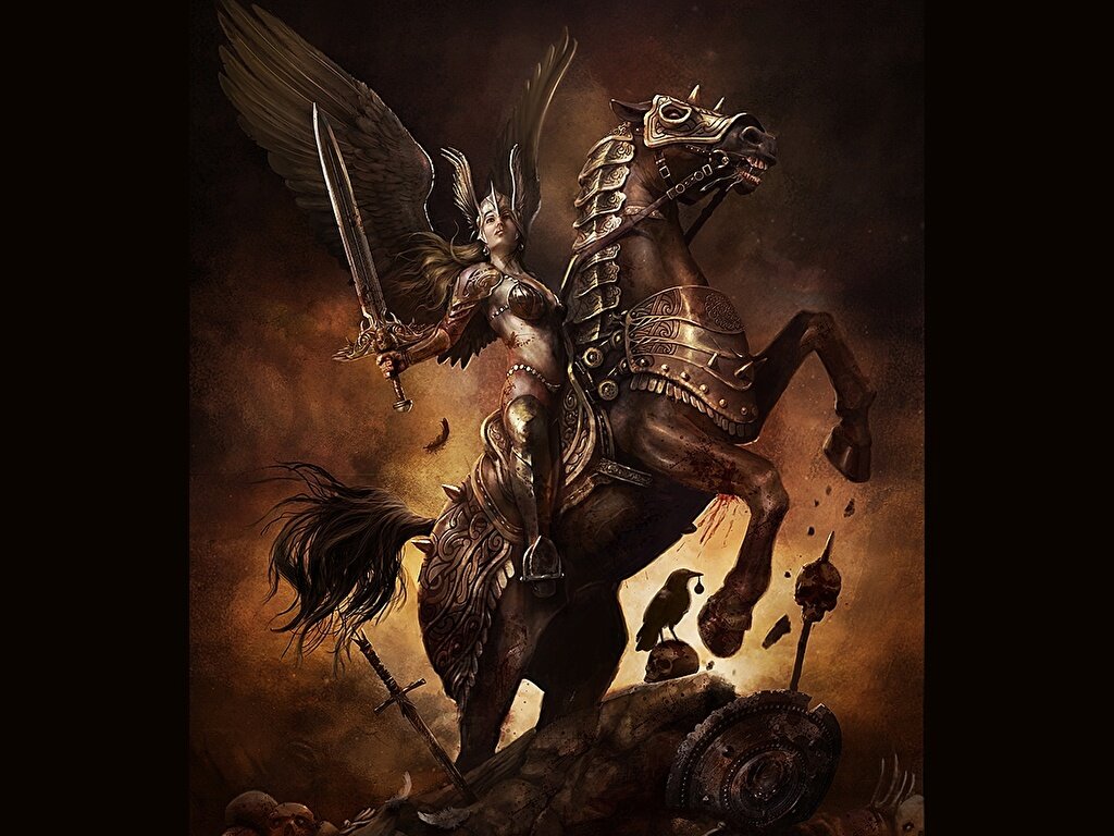 Бесстрашно и гордо взглянула она В безмолвие мрачной долины. Ловко вскочила на спину коня, Умчалась, подобна богине.