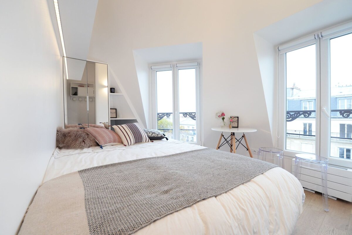 Многие Парижане живут в пригородах, а работают в городе, поэтому в столице Франции так популярны маленькие квартирки, куда владелец приходит ночевать по будням, чтобы не тратить время на дорогу до дома. Эта студия площадью 9 кв.м является таким "перевалочным пунктом" для своего владельца. Раньше же она исполняла роль комнаты горничной, а позже жилья для студента. Дизайнеры Valérie Laporte-Volatier, Charlotte Soissons Lenormand и Brice Bourdon из агенства Les Murs ont des oreilles сумели переработать это малюсенькое пространство так, что квартира стала вполне пригодной для жизни одного человека. До ремонта студия напоминала студенческую общагу, где совершенно не было места для хранения, а вся мебель была очень неудобной. Зато в студии было целых два шикарных окна, которые были освобождены от штор, чтобы впустить больше естественного света. Дизайнеры выбрали белый и светло-бежевые цвета для общего фона, потому что именно благодаря им пространство зрительно увеличилось. Также дизайнеры п