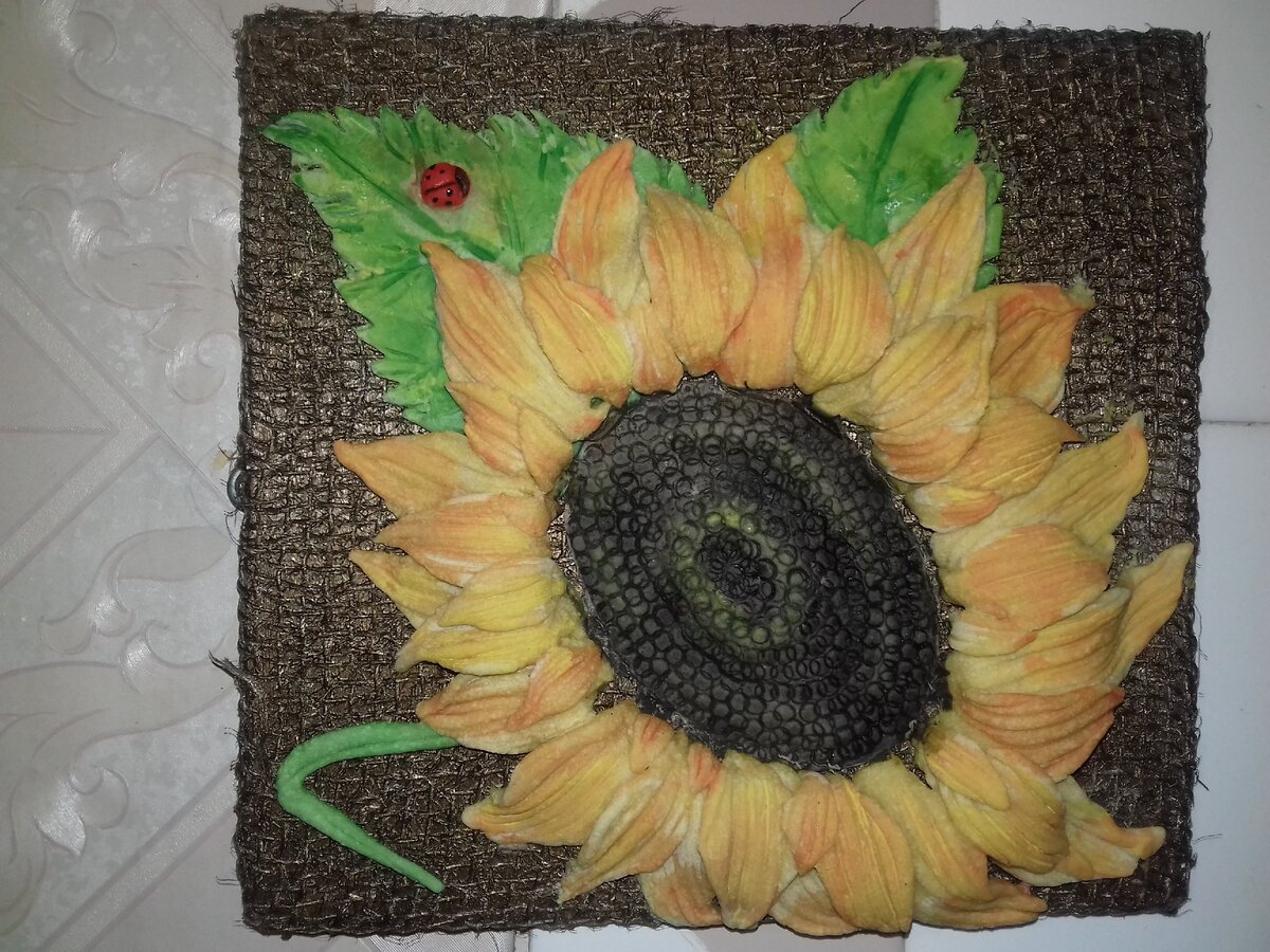 Лепим подсолнух из солёного теста. Полный видео мастер класс можно увидеть здесь - https://youtu.be/QqH-g5Si3A0 Для лепки такого подсолнха использовала солёное тесто. Оно хорошо подходит для лепки лепестков. Рецепт его приготовления можно здесь -👉 https://youtu.be/Ef0W4F9U-ik Для основы взяла фанеру. Обклеила мешковиной на клей пва Тесту придаем каплевидную форму , расплющить листок. Инструментом проделать прожилки. Приклеить на клей пва. Лепим серединку овальной формы, середине сформировать "кратер ". Трубочкой от сока продавить семена. Скатать жгутики наклеить вокруг серединки Лепим лепестки. Из каплевидной формы , расплющить лепесток. Проделать прожилки. Лепестки лепить заостренные придать изогную форму. Наклеить нижний ряд лепестков. Наклеить разбавленный клей пва. Заполнить дальний ряд лепестков, делая их немного меньше, чтобы подсолнух казался отвернутым немного . Второй ряд лепестков лепить чуть мельче нижних лепестков, наклеивать их между ле
