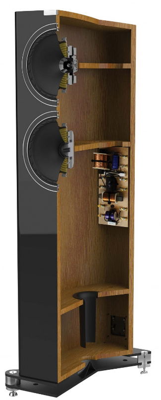 Видите? Смотрите с самого верха. Тут и среднечастотник зачем-то сообщается с камерой басовика, и камера второго басовика какая-то многокамерная - и вверх уходит часть волны, и за трубой фазоинвертера какой-то доплнительный объем. Это все хитрые акустические процессы ориентированные на формирование дополнительных звуков а не их поглощение.