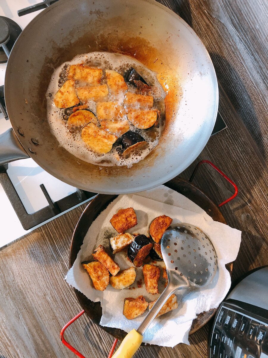 Лада седаа-ан..китайский бак-ла-жан!😄🇨🇳 🍆 ⠀ Точнее не знаю какой..тайский,китайский или японский, в общем зачётный баклажан👌⠀ У меня даже сын ел,который к ним мягко говоря холоден,даже когда голоден!😄 Есть два пути приготовления,простой и супер-простой!✌️⠀ Вот первый👇⠀ ❗️Баклажаны по-китайски🍆🥢⠀ 🍀Баклажаны нарезать размером с грецкий орех и опустить в соленую воду под пресс,пока готовим соус.⠀ 🍀Собрать в сотейнике: сладкий соус чили,соус терияки,яблочный или рисовый уксус,кетчуп,устричный соус (если есть),мед и слегка разбавить кипяченой водой. (Пробуйте,чтобы поймать «вашу» сладость,кислоту и соль) 🤏 ⠀ Довести до кипения и затянуть крахмалом (консистенция жидкого меда).⠀ 🍀Баклажан обсушить,обвалять по очереди:в муке/яйце/панировочных сухарях и обжарить в масле до золотистого цвета,удалить лишний жир салфеткой и перемешать с соусом🥡⠀ ✌️Супер-простой вариант-это обвалять кубики баклажана в крахмале,обжарить во «фритюре»и перемешать с горячим соусом..1-2-3👌⠀ Как говорит ки