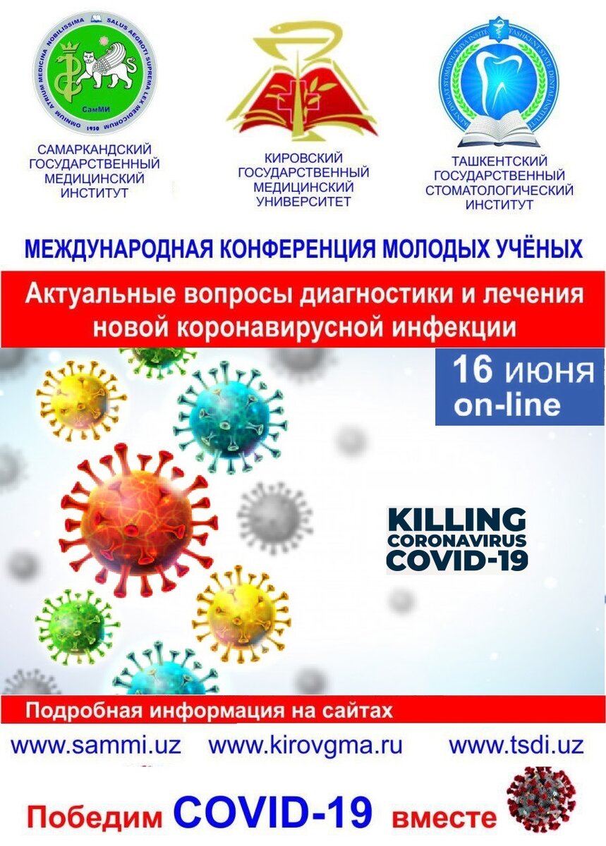 Уважаемые студенты и молодые учёные! Самаркандский государственный медицинский институт совместно с Ташкентским государственным стоматологическим институтом и Кировским государственным медицинским университетом приглашает Вас принять участие в работе Международной конференции молодых учёных «Актуальные вопросы диагностики и лечения новой короновирусной инфекции». Конференция пройдёт в режиме on-line 16 июня 2020 года По результатам конференции будет опубликован сборник материалов. Индексирование в РИНЦ Полнотекстовый формат будет доступен на сайте Российской Научной Электронной Библиотеки www.elibrary.ru Участие в работе конференции и публикация научных статей и материалов в сборнике – БЕСПЛАТНО Сроки подачи статей на участие в конференции – до 12 июня 2020 года E-mail: sovet@kirovgma.ru Материалы конференции: Программа.pdf Конференция пройдёт: в онлайн-формате. Начало с 9:00 ч.