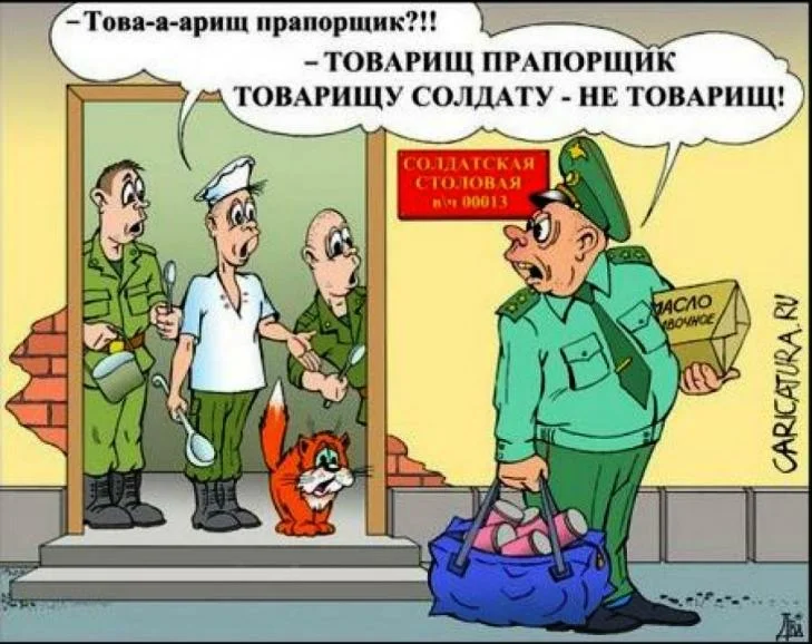 Сидит в засаде душман. Впервые на задании - снайпер. Позиция оборудована как надо, просматривает с горы значительную часть дороги. И видит душман как по дороге идёт полковник. Быстрее достаёт справочник с ценами, листал - листал, нашёл. Полковник - 2000$!!! Хвать винтовку снайперскую - а полковник уже ушёл!... Сидит душман дальше. По дороге идёт майор. Душман бегом справочник листать - нашёл майора, там премия 1000$. Хвать винтовку - а майор уже ушёл!... Следующим прошёл лейтенант, там цена вопроса 500$, но пока душман это выяснил лейтенант тоже ушёл. Решил тогда душман изменить тактику - сначала стрелять, а потом уже выяснять куда попал. И призвав в помощь Аллаха приложился к оптическому прицелу оборевая дорогу. Появляется на дороге прапорщик - выстрел - попал! Теперь уже не торопясь душман достаёт справочник и начинает вдумчиво изучать - искать что заработал. Весь справочник перерыл - ну нет прапорщика! Да как так, должен быть! Открывает последнюю страницу - а там перечислены штраф