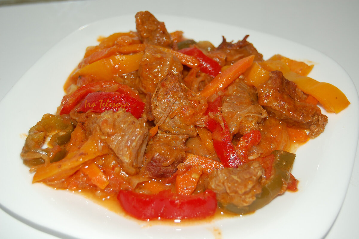 В жаровне с толстым дном разогреть растительное рафинированное масло. Положить туда мелко нарезанные 1,5 луковицы и 1 морковь. (Эти овощи станут частью мяса и подливки.) Обжарить. Теперь туда же добавляем говядину, нарезанную небольшими кусочками. Обжарить на довольно сильном огне, чтобы мясо не потеряло сок. Залива