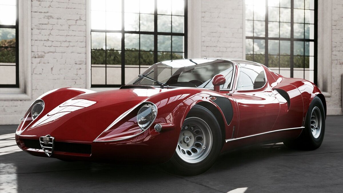 В 1967 году на автовыставке в Монце, Италия, был представлен среднемоторный спорткар Alfa Romeo 33 Stradale. Он являет собой «дорожную» версию гоночного авто, выпущенного двумя годами ранее – Alfa Romeo Tipo 33. Когда гоночный Tipo 33 впервые победил на соревнованиях в 1967 году, производитель убедился в правильном решении выпустить серийную дорожную версию. Всего было выпущено 17 экземпляров, 5 из которых находятся в музее Альфа Ромео. Доступный спорткар с двигателем от Карло Кити Двигатель 33 Stradale не имеет ничего общего с серийными моторами Alfa Romeo. Это V8 объемом 2.0 из алюминия, созданный гоночным конструктором Карло Кити. Мощность двигателя составляет 230 л.с. на 8800 об/мин (Stradale) и 270 л.с. в гоночной версии. Это спорткар, но производитель хотел сделать его доступным для ежедневного использования. Поэтому показатели скорости слегка ограничены. Max speed – 260 км/ч. Разгон до 100 км/ч – 5.5 сек. При таких показателях, масса автомобиля всего 700 кг, что делает его неве