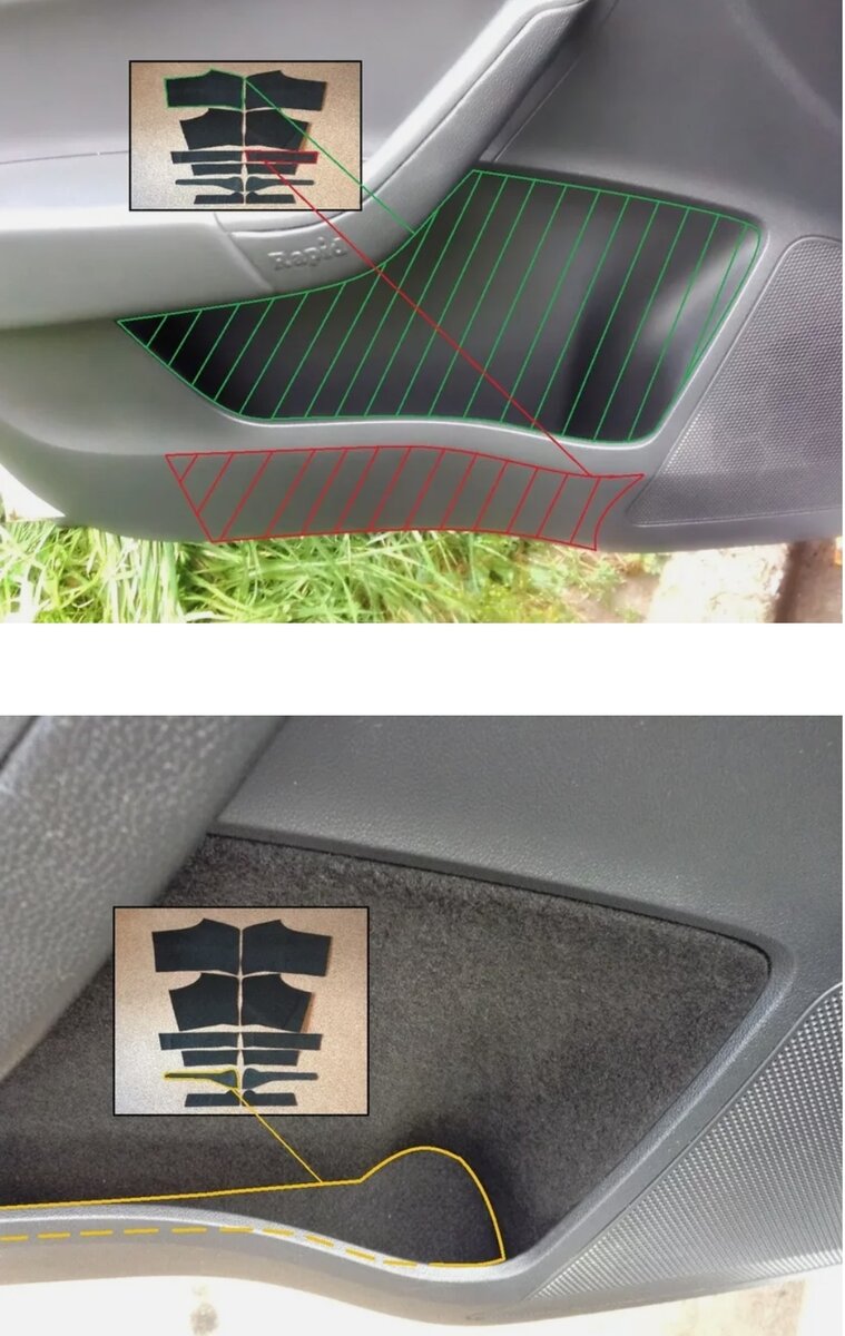 Всем добрый день, туту я решил разместить инструкцию к предыдущему посту, так скажем теоретической и наглядное пособие по поклейке карпета. Инструкция по установке обивок дверных карманов: В первую очередь разделите комплект на две части, одна часть идет на левую сторону другая на правую сторону дверей. Далее подготовьте инструмент необходимый для поклейки, а именно: — мыльный раствор (пропорция 3-4 капли моющего средства на 0,5 литра воды) — пульверизатор (20-70р. в любом хоз. магазине) — спирт или обезжириватель и тряпка для него — тряпка для сбора воды со дна кармана — сам кусок карпета, который собираетесь клеить. Следующим действием возьмите кусок материала и просто приложите его на предполагаемое место оклейки, постарайтесь расположить его таким образом, как впоследствии он у вас будет приклеен. Эта процедура поможет вам понять как должен располагаться материал на "местности" и впоследствии сэкономит время позиционирования во время поклейки "на живую"))) Четв