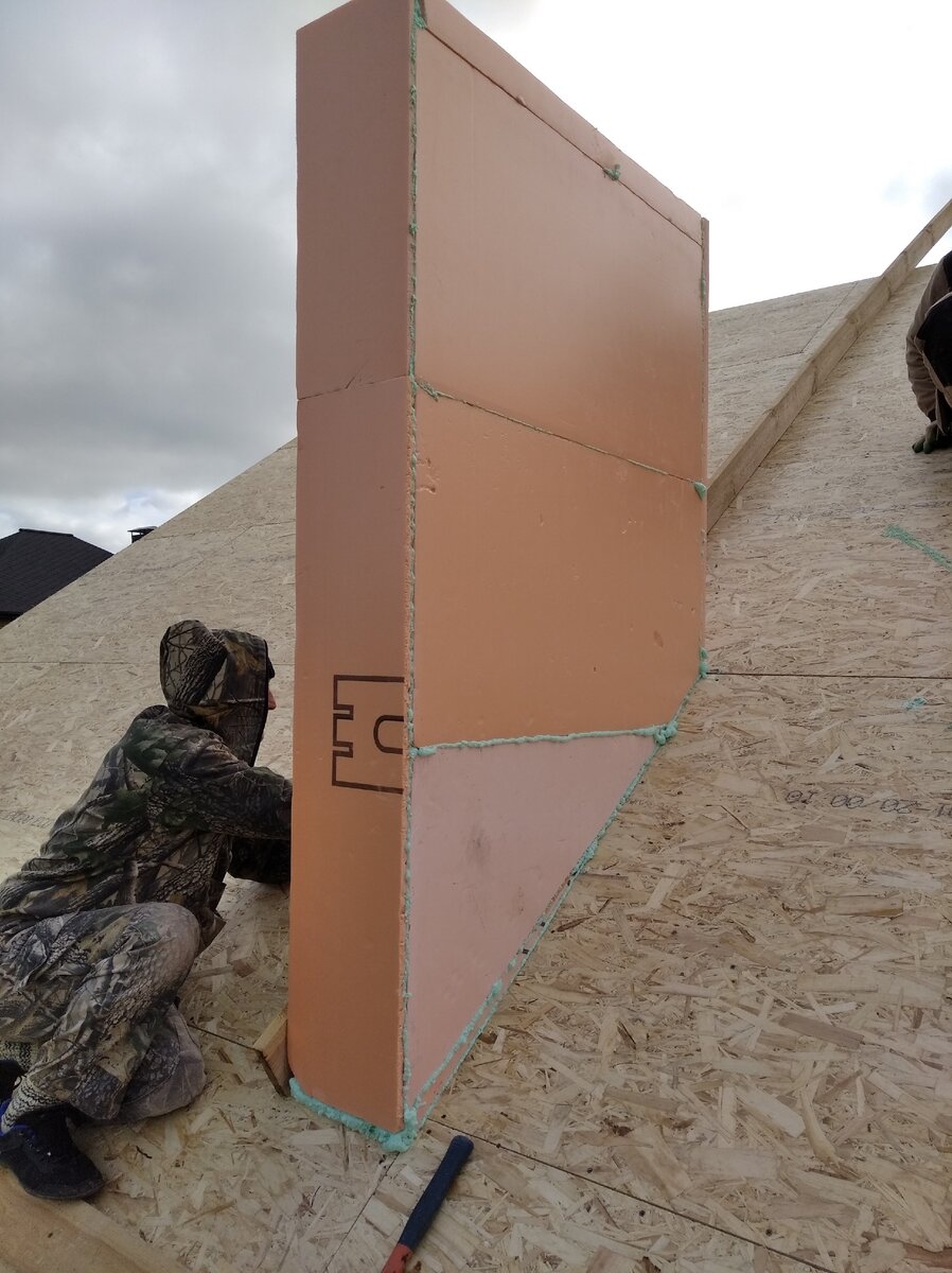 Пеноплекс клеим монтажным клеем Именно монтажный клей, а не монтажное пенно.Швы и щели тоже наполняем монтажным клеем.Это видно на основной картинке.Чтобы кладка полностью была закрыто пеноплексом.ни какой дырки для утечки теплого воздуха.Торцы дымохода тоже клеим пеноплексом и все углы запеним монтажным клеем.После это начнем устанавливать из доски 25 на 150 или 125 коробку для OSB фанеры.